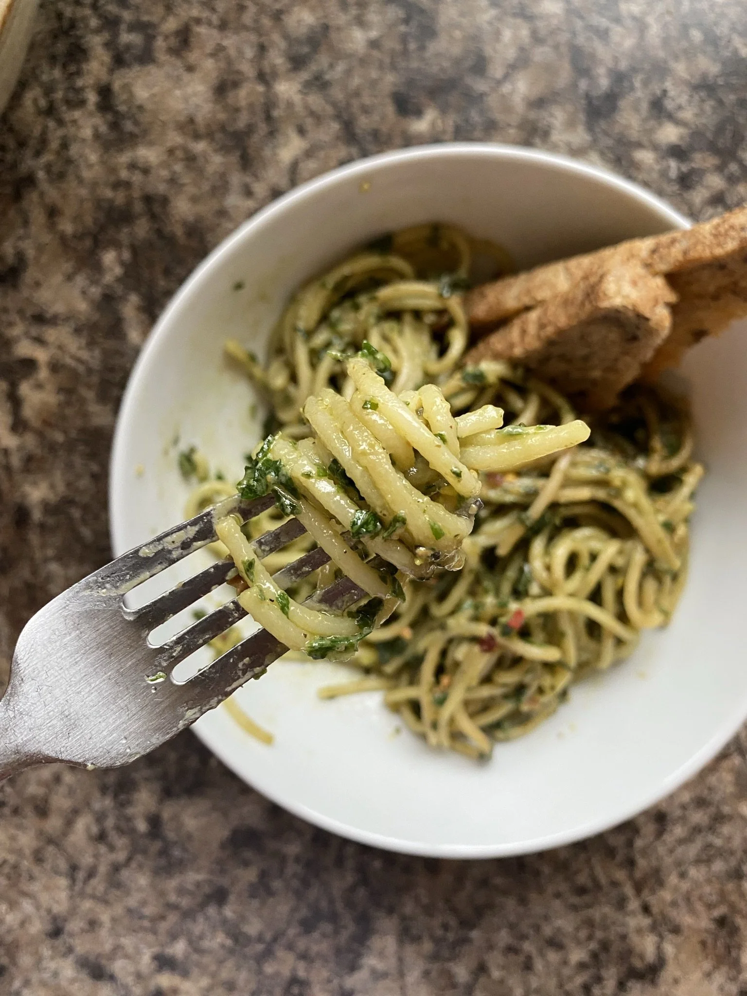 In a food processor, combine pistachios and garlic. Pulse until it resembles a coarse meal. Add parmesan, salt and pepper and process until combined. Add basil and parsley. It will probably fill the full bowl. Continue processing until basil and parsley are roughly chopped. You can get as fine as you like, but I tend to leave mine a little chunkier (aka more rustic) because I like a big bite of basil in my pesto (as opposed to one that’s perfectly smooth.