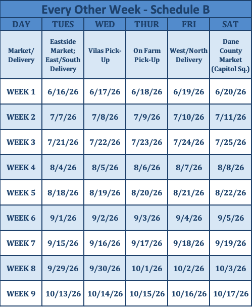 If you decide to get your CSA share every other week, below are the two schedules (Schedule A or Schedule B) to choose from: